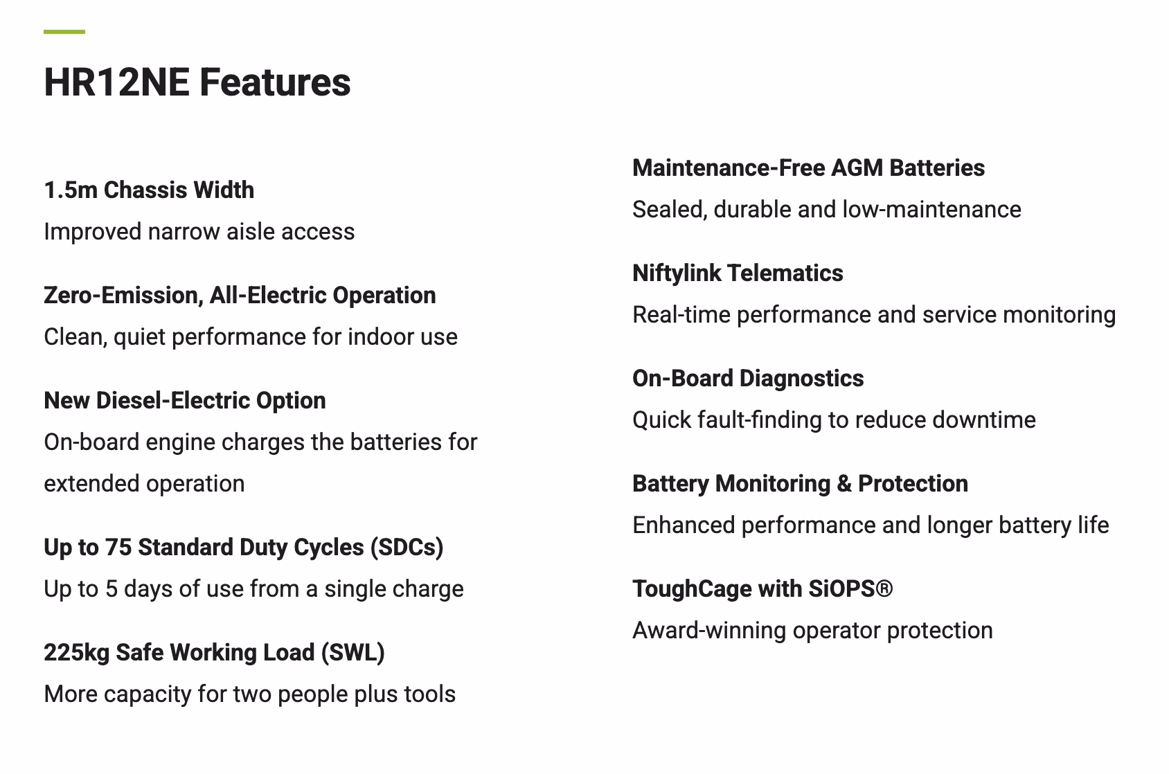 The HR12NE utilises a super-efficient battery power system with an all-electric drive. It has a standard duty cycle of 75 allowing the HR12NE to work up to 5 days on one charge.